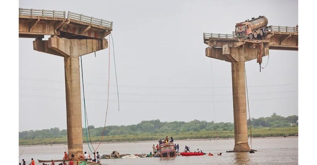 गुजरात के वडोदरा जिले में मंगलवार तड़के एक दर्दनाक हादसे में 10 लोगों की जान चली गई जब महिसागर नदी पर बना करीब 40 साल पुराना गम्भीरा ब्रिज ढह गया। इस हादसे में दो ट्रक, एक बोलेरो जीप और अन्य वाहन नदी में जा गिरे, जिससे पांच लोग गंभीर रूप से घायल भी हो गए। यह पुल मध्य गुजरात और सौराष्ट्र को जोड़ता है और इसके ढहने से पूरे इलाके में हड़कंप मच गया। घटना के बाद लोगों में भारी आक्रोश देखा गया क्योंकि यह सामने आया कि ब्रिज की हालत को लेकर सरकारी विभागों को पहले से ही जानकारी थी, लेकिन समय रहते कोई कार्रवाई नहीं की गई।